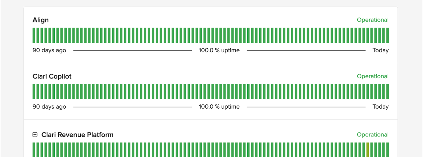 Clari maintains continuous compliance across our organization and product suite in accordance with multiple industry standards. You can find detailed information about all of Clari’s security certifications in our Assurance Center.